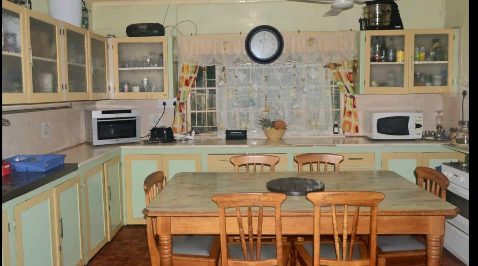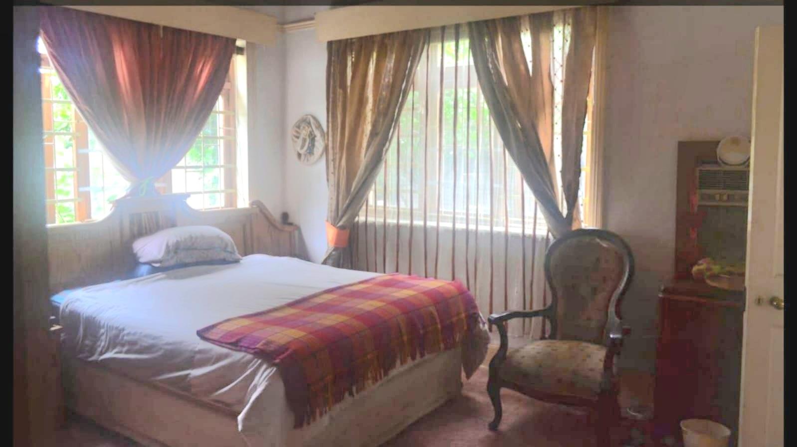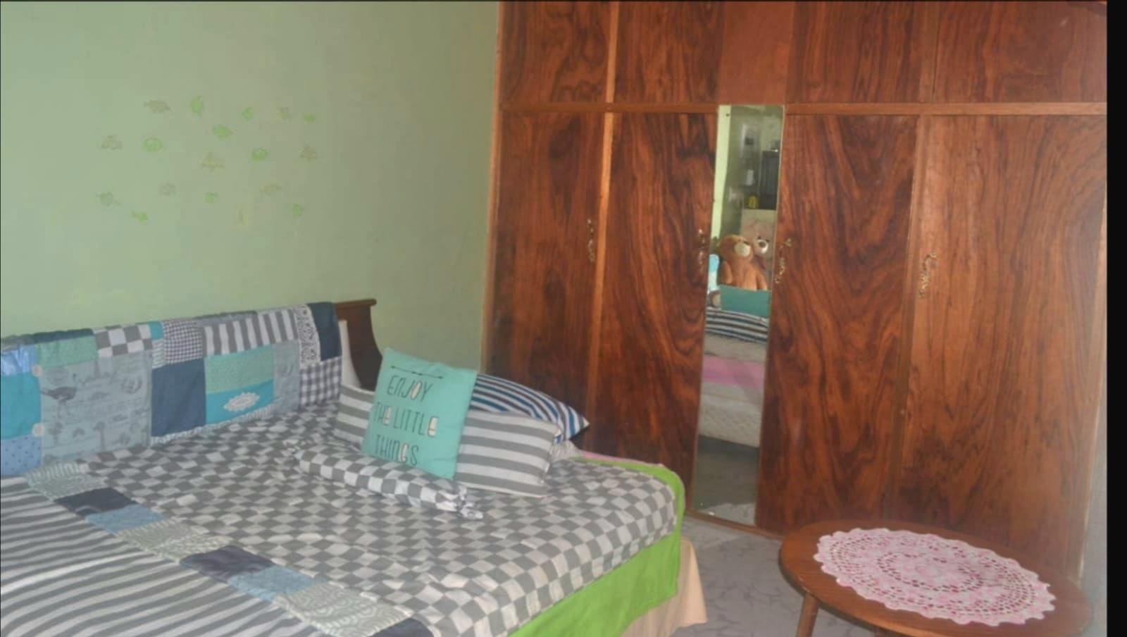 Facing the main street, you will find this spacious tree-filled family home, with high steel ceilings, consisting of 3 Bedrooms, a bathroom with a separate living and dining room and a study with a separate scullery. The flat consists of a bedroom and bathroom with a porch adjacent to the house. The whole property is fenced with pre-paid electricity.