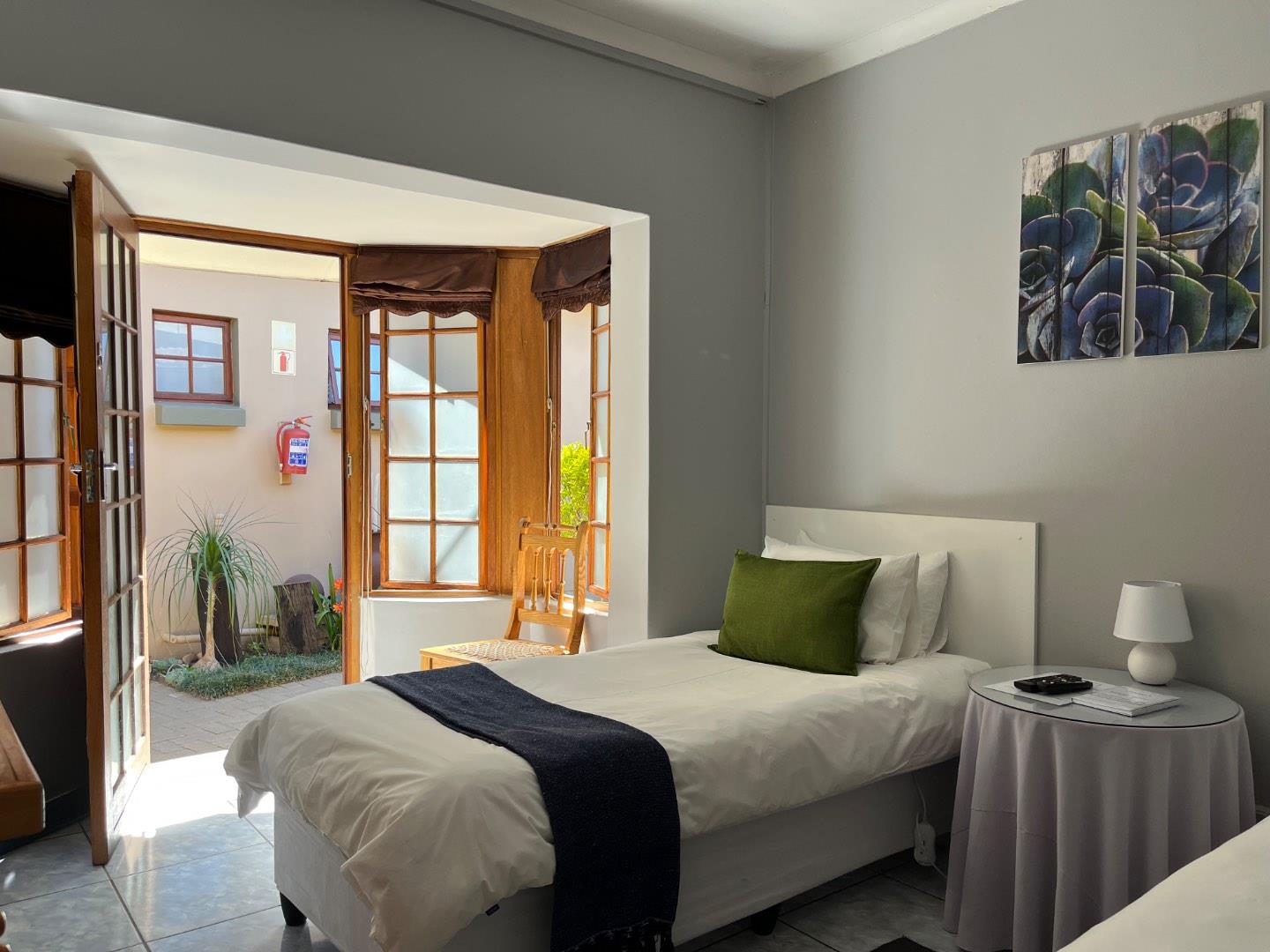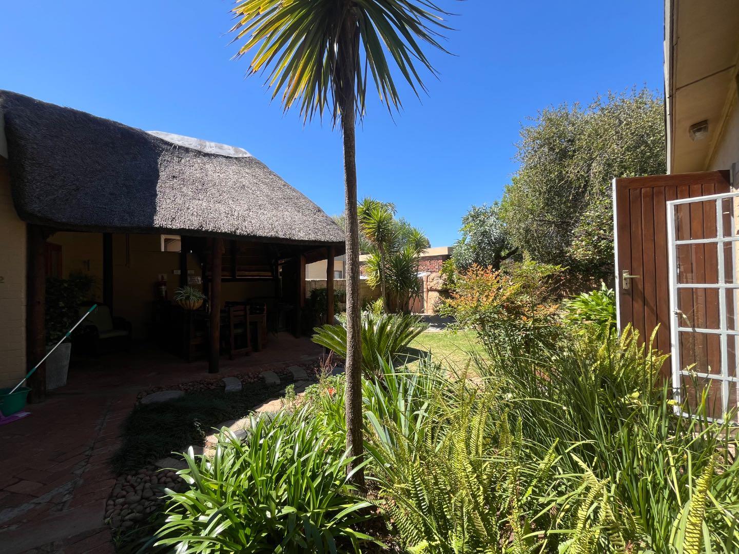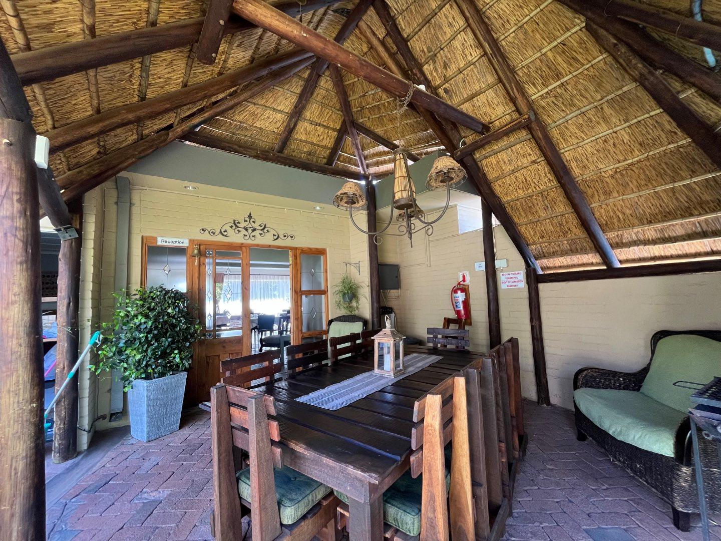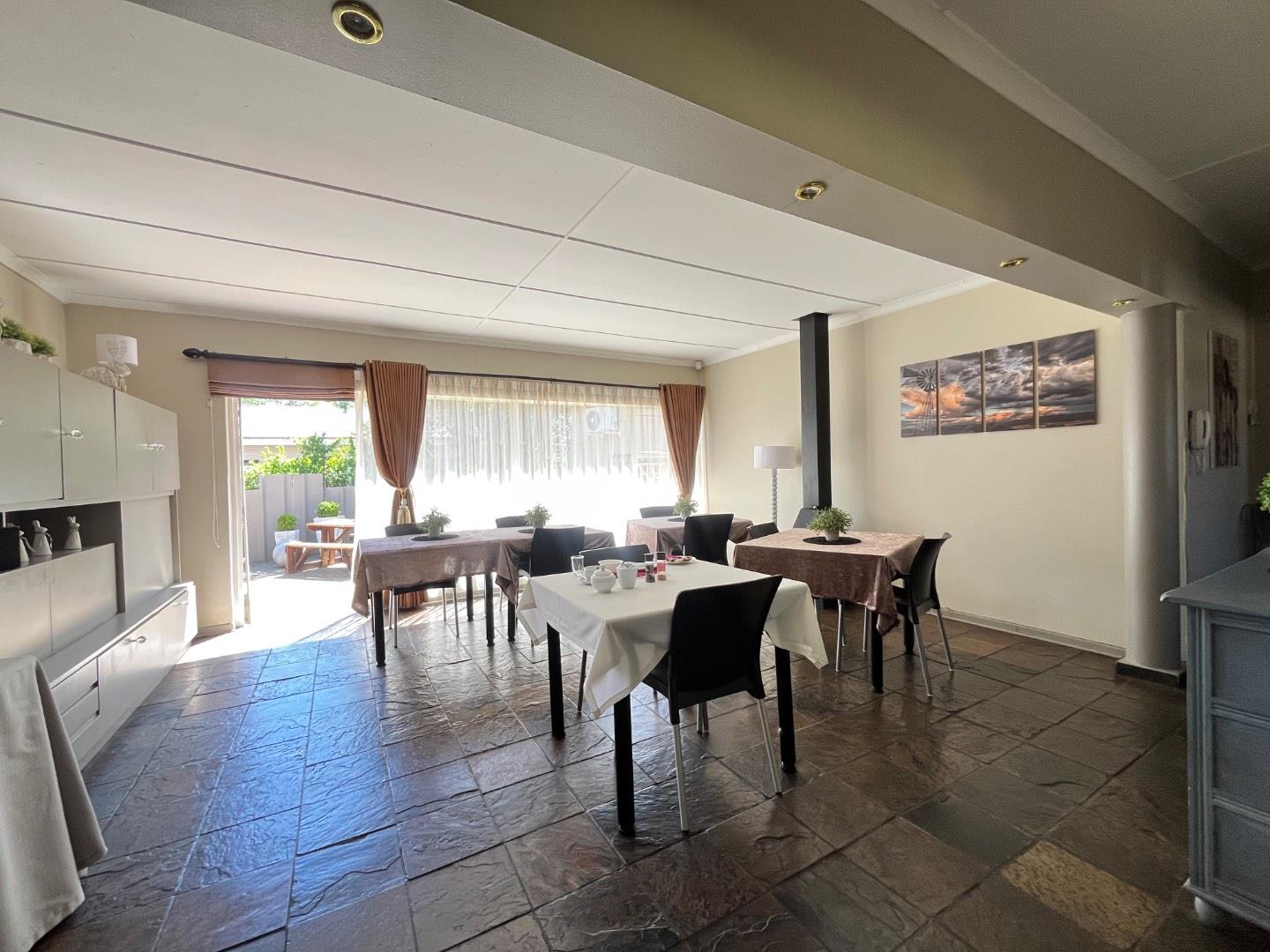 A separate flatlet with its own entrance includes a bedroom, bathroom, and living area—perfect for a manager’s accommodation. Guests are welcomed through a lush, manicured garden leading into the reception area adjacent to a cozy dining space with a built-in fireplace, creating a warm and inviting atmosphere.