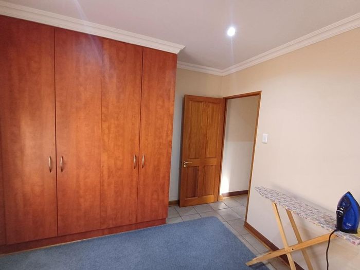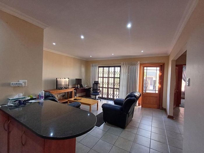 Modern 2-bedroom, 2-bathroom unit with open-plan living, stylish kitchen, garden, double garage, and convenient utilities in Blue Canyon complex.