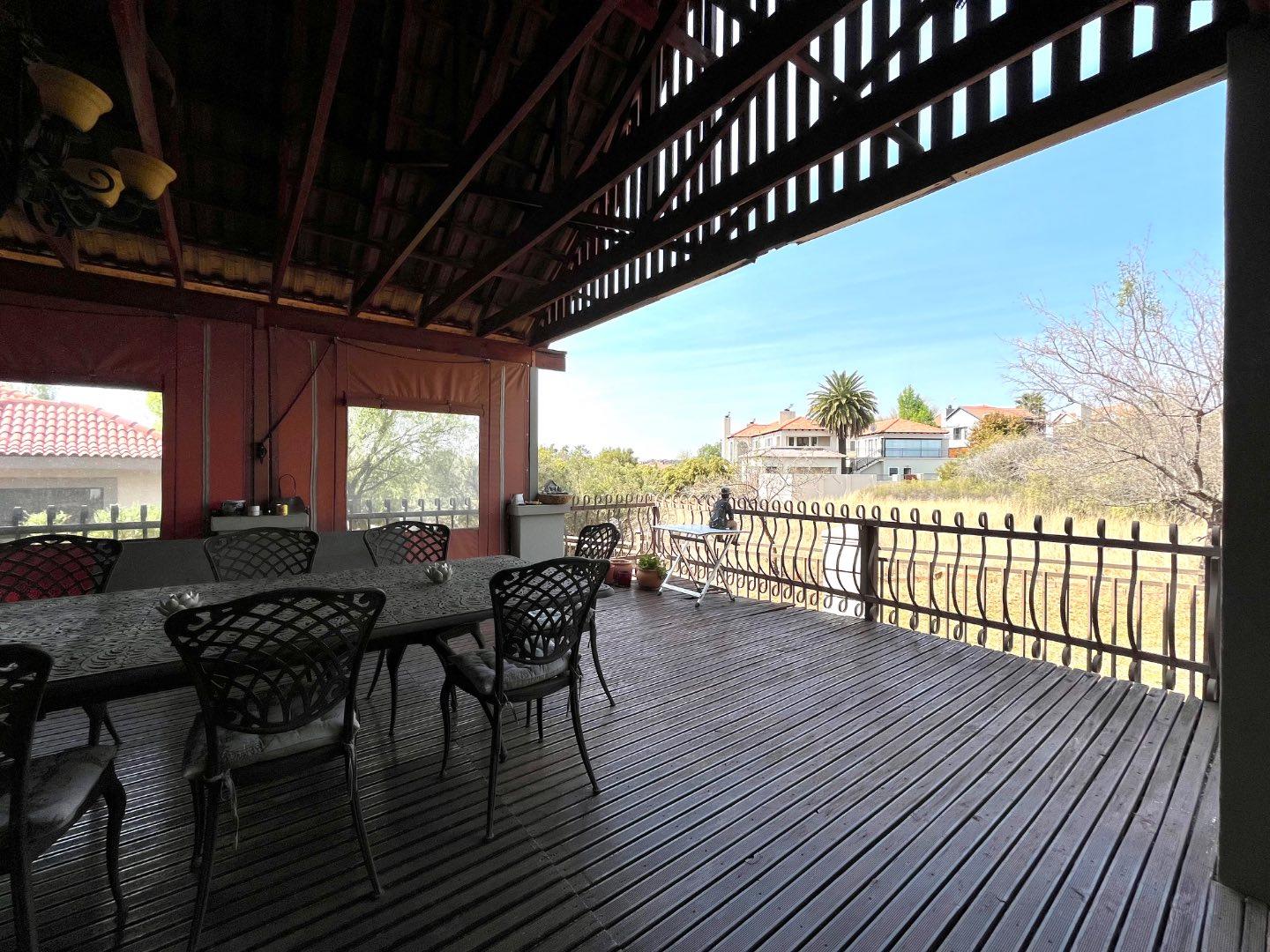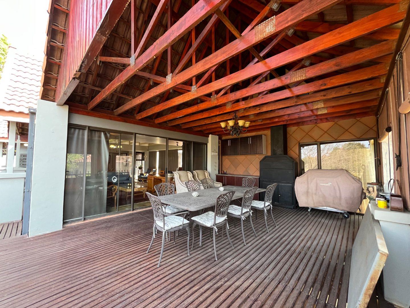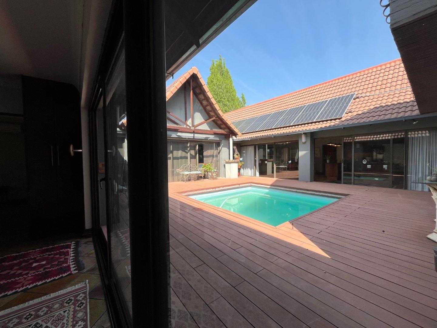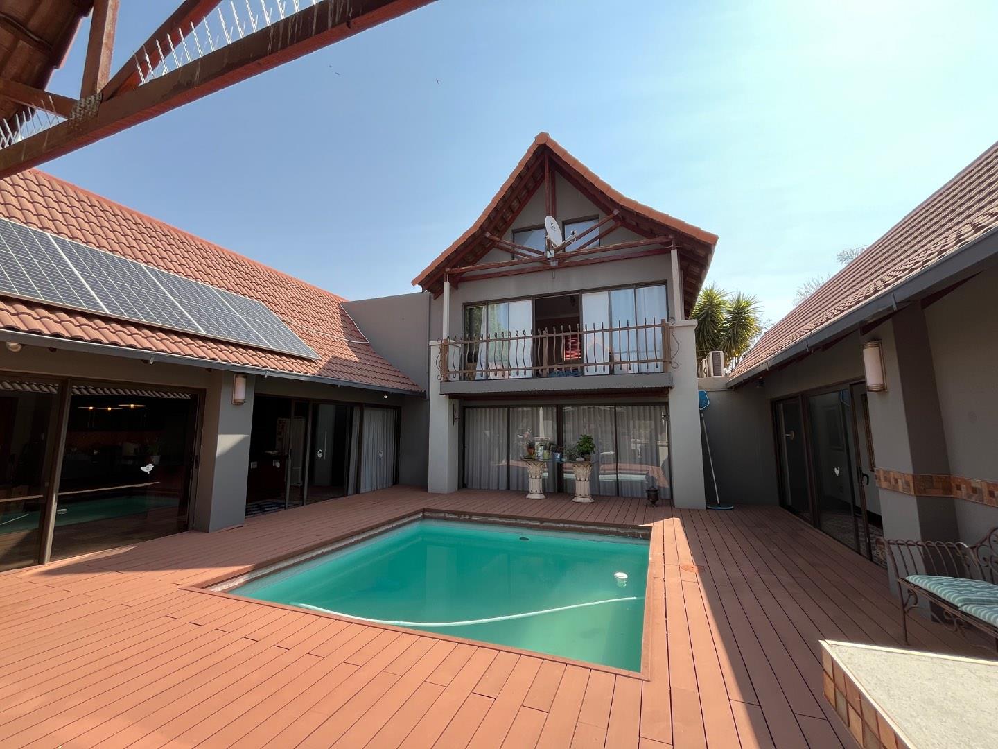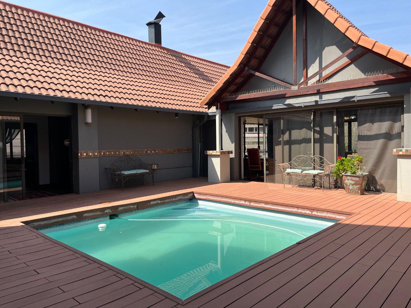 A covered stoep with a built-in braai overlooks the tranquil green area, perfect for relaxed gatherings with family and friends. Accommodation includes four generous bedrooms, three situated downstairs. The main bedroom boasts a luxurious en suite bathroom and walk-in closet. Upstairs, the fourth bedroom offers its own bathroom and a private balcony with a view of the pool.