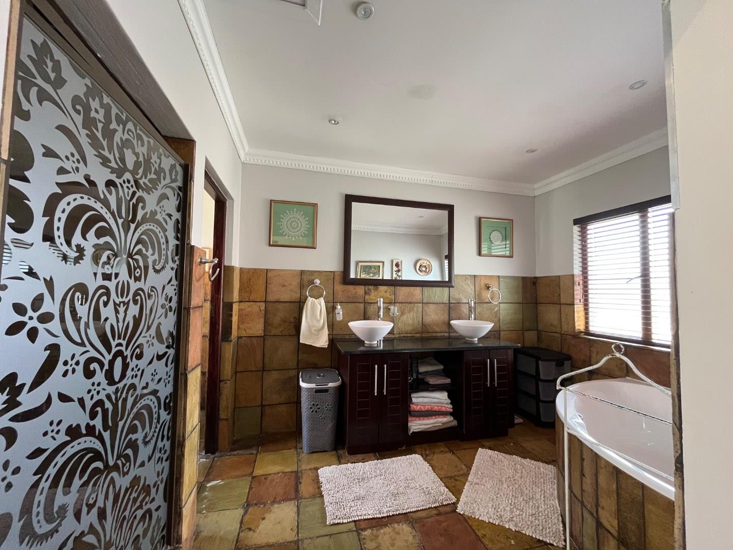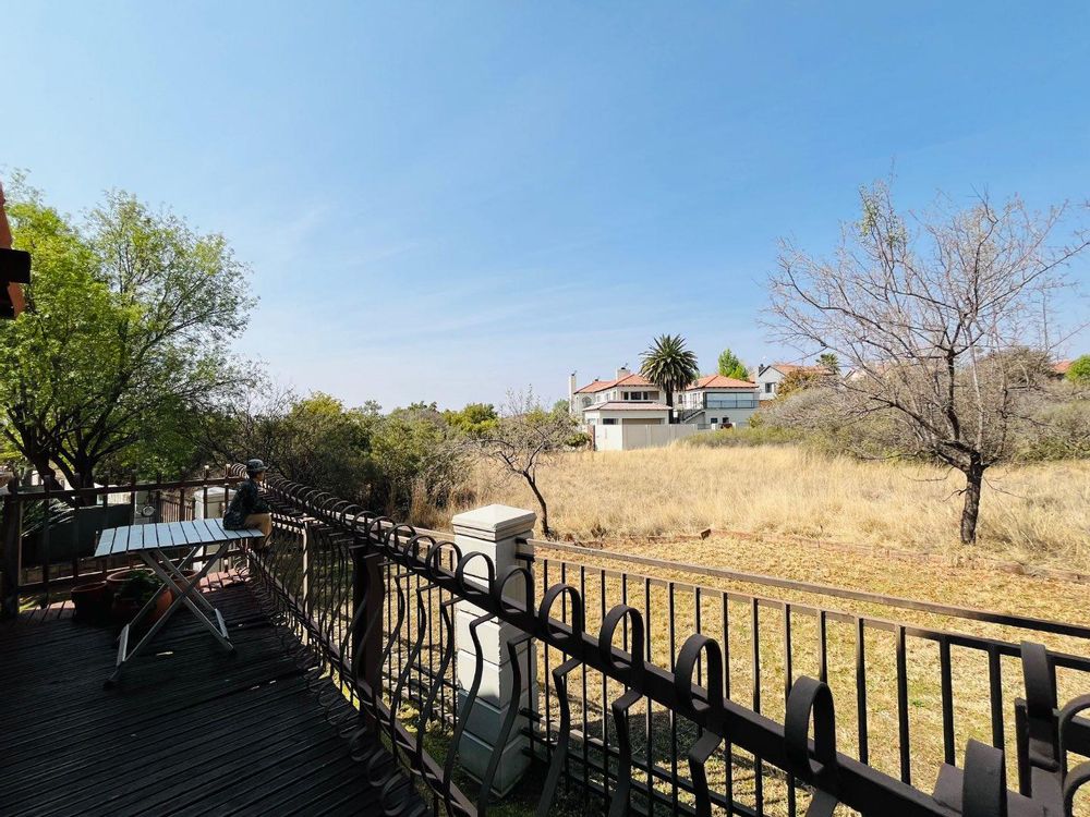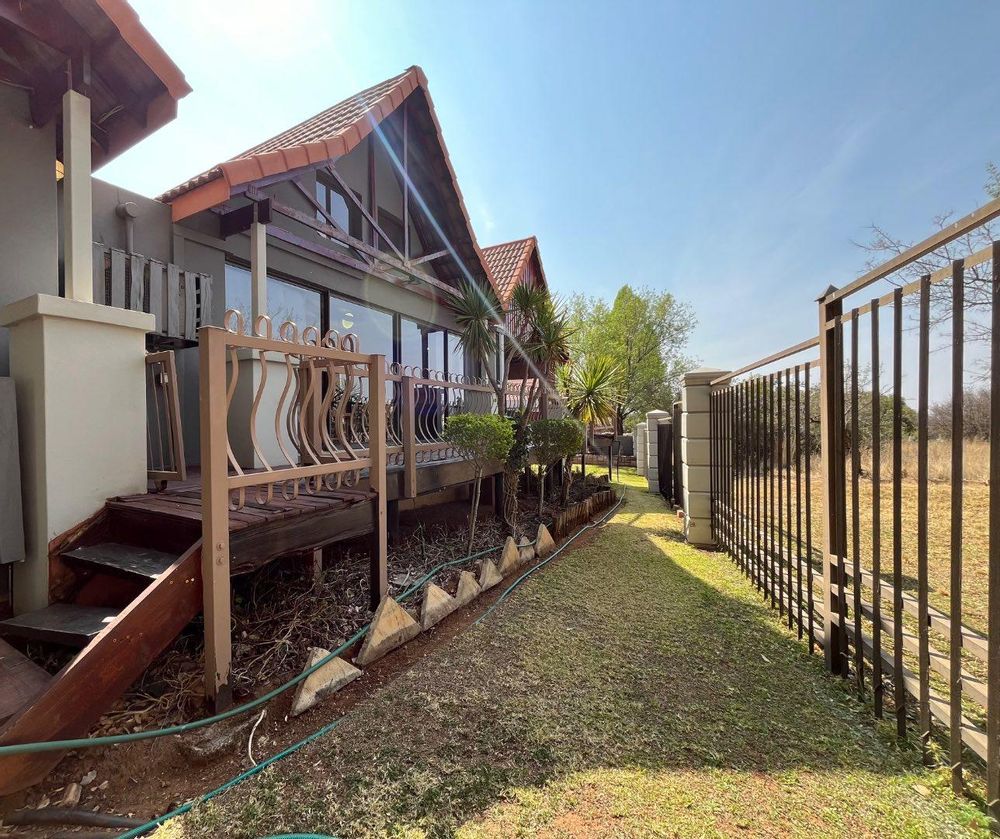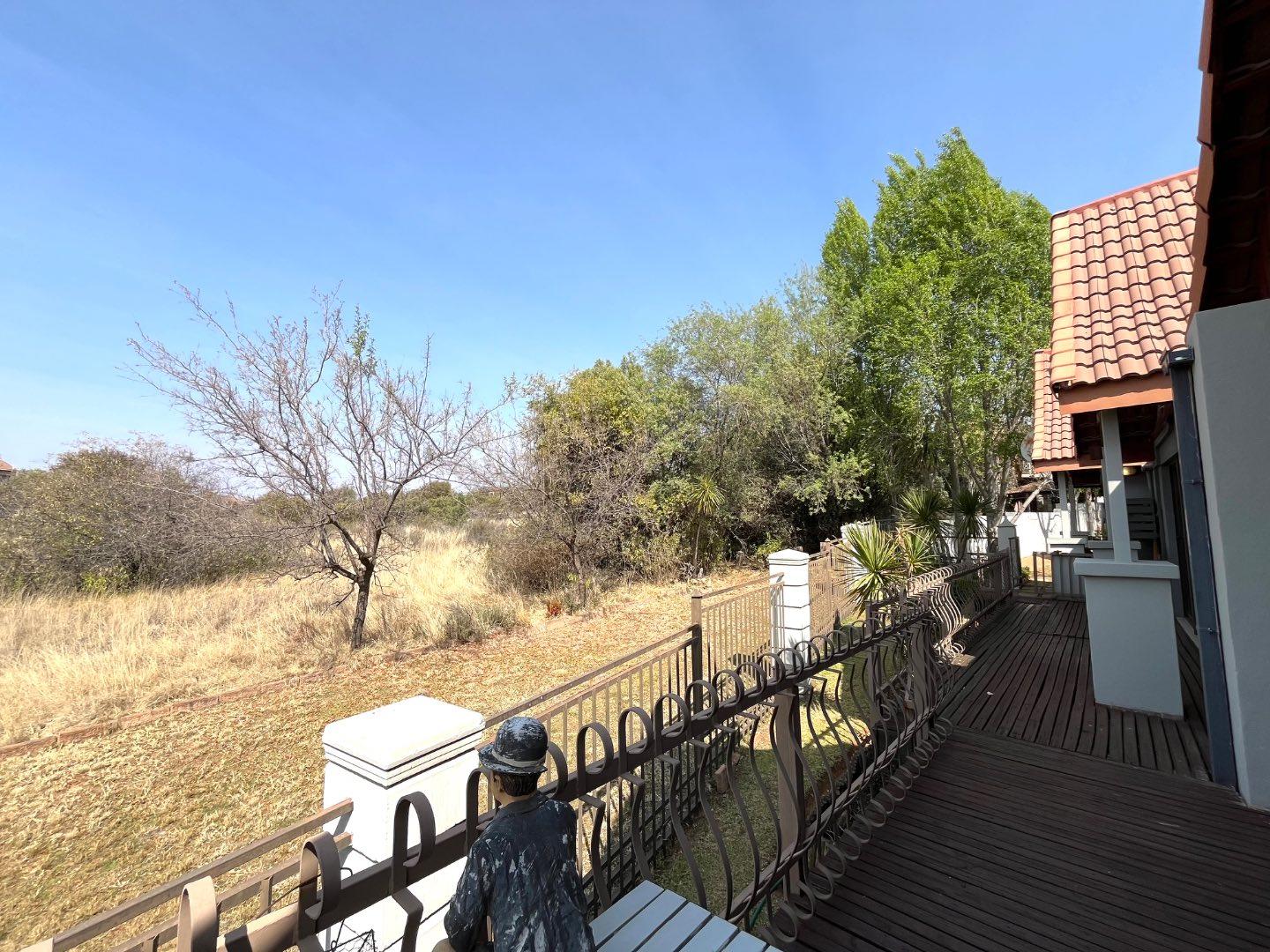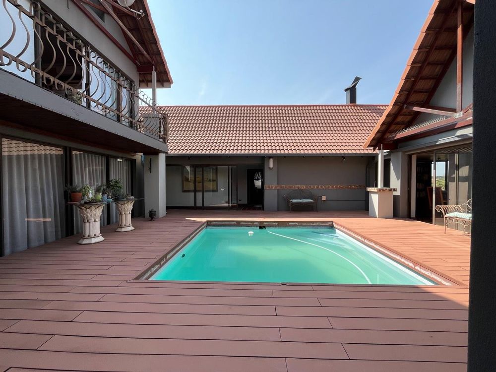 A covered stoep with a built-in braai overlooks the tranquil green area, perfect for relaxed gatherings with family and friends. Accommodation includes four generous bedrooms, three situated downstairs. The main bedroom boasts a luxurious en suite bathroom and walk-in closet. Upstairs, the fourth bedroom offers its own bathroom and a private balcony with a view of the pool.