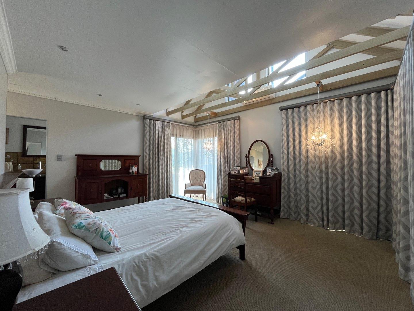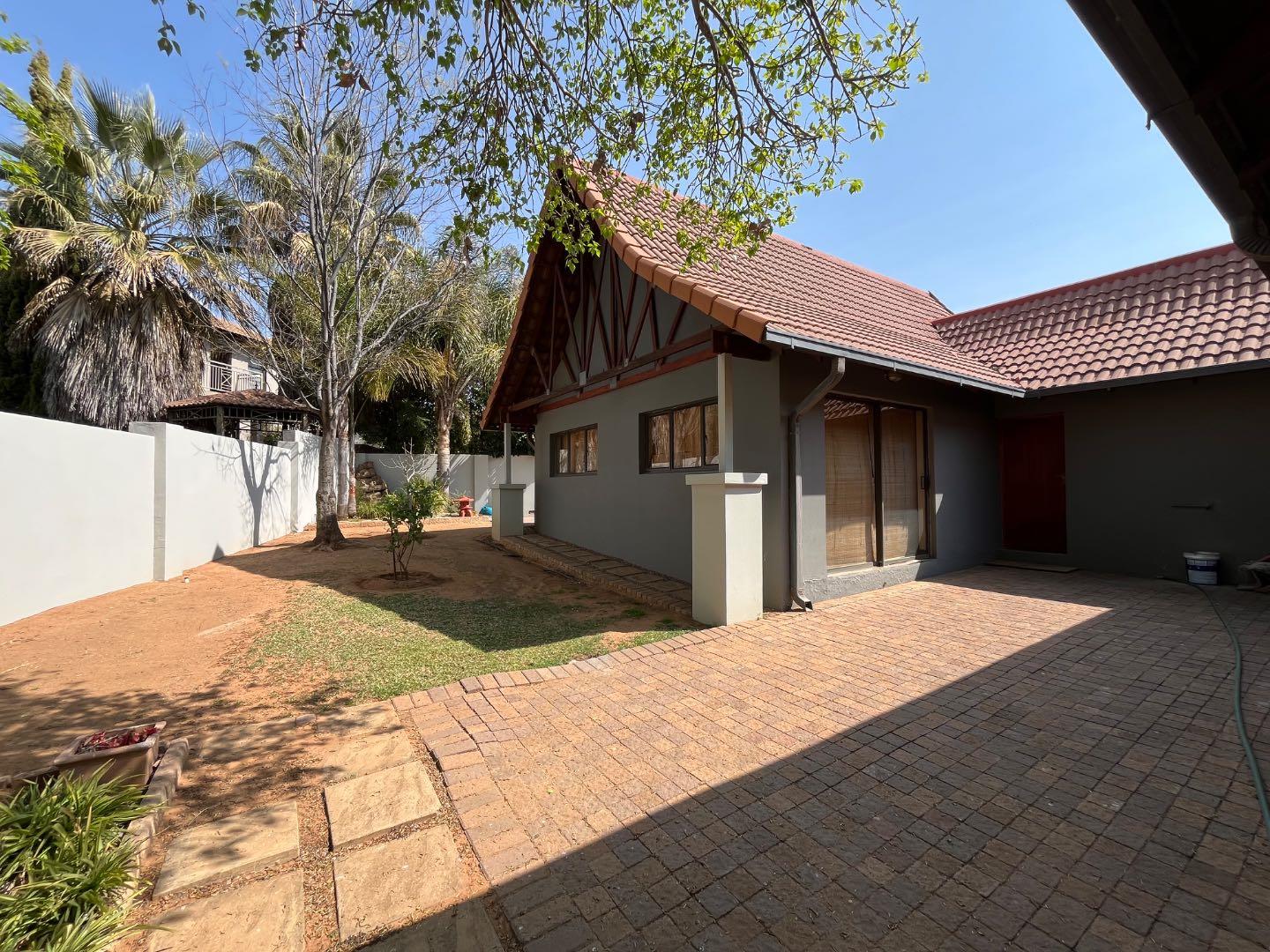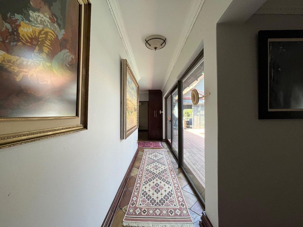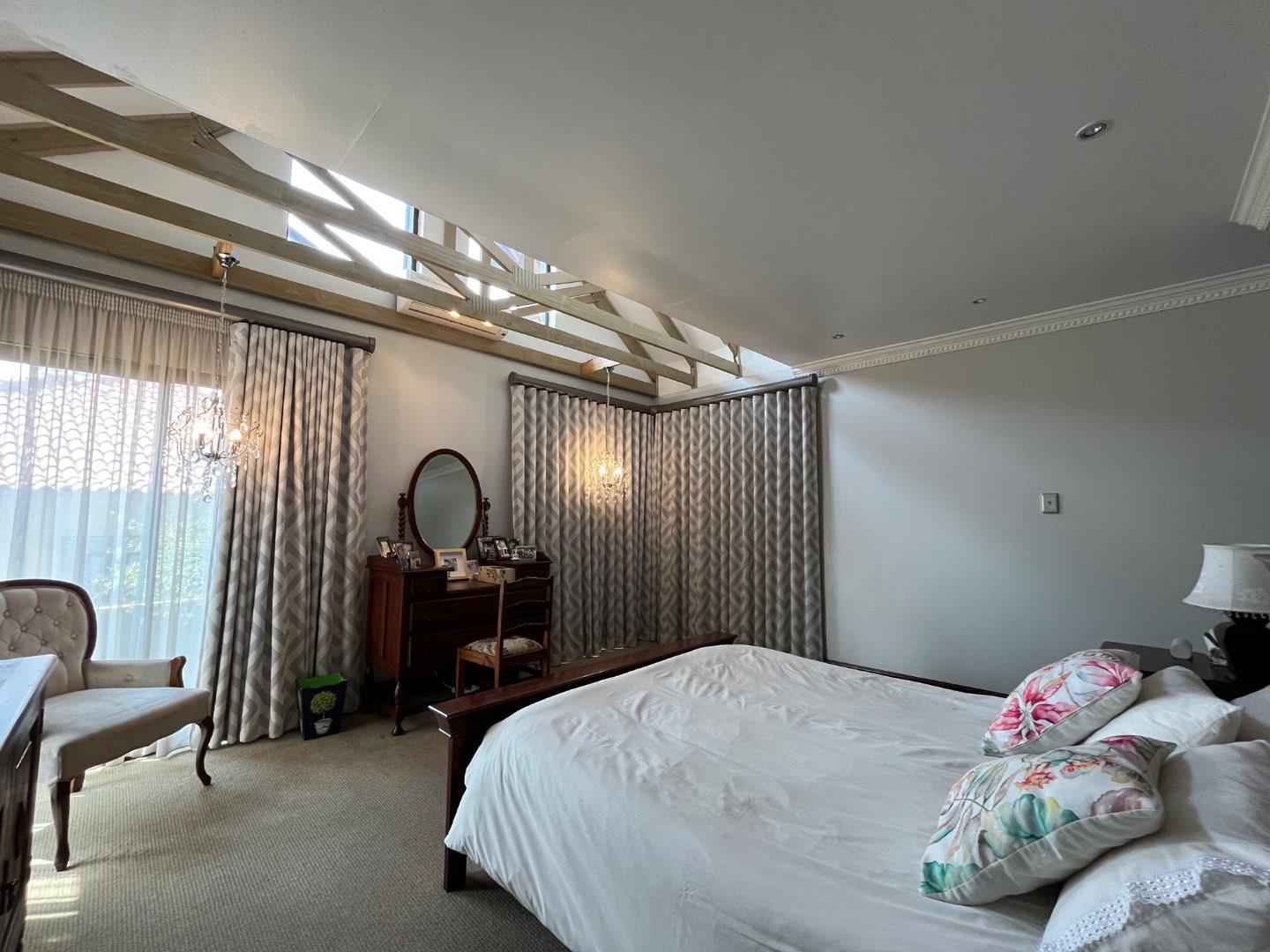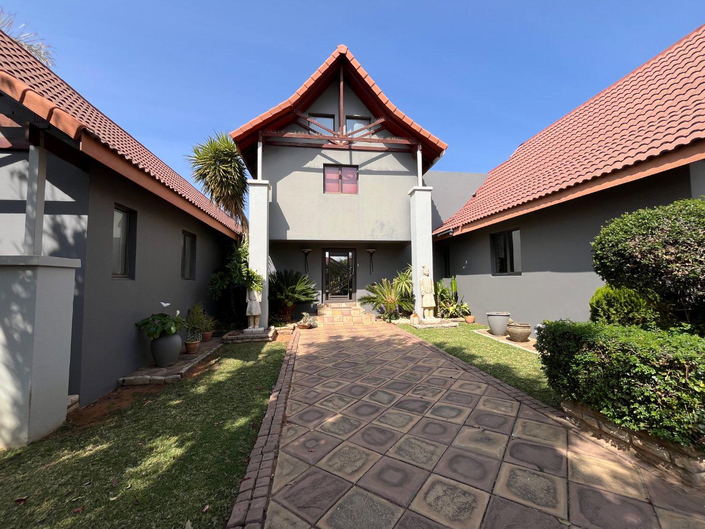 A covered stoep with a built-in braai overlooks the tranquil green area, perfect for relaxed gatherings with family and friends. Accommodation includes four generous bedrooms, three situated downstairs. The main bedroom boasts a luxurious en suite bathroom and walk-in closet. Upstairs, the fourth bedroom offers its own bathroom and a private balcony with a view of the pool.