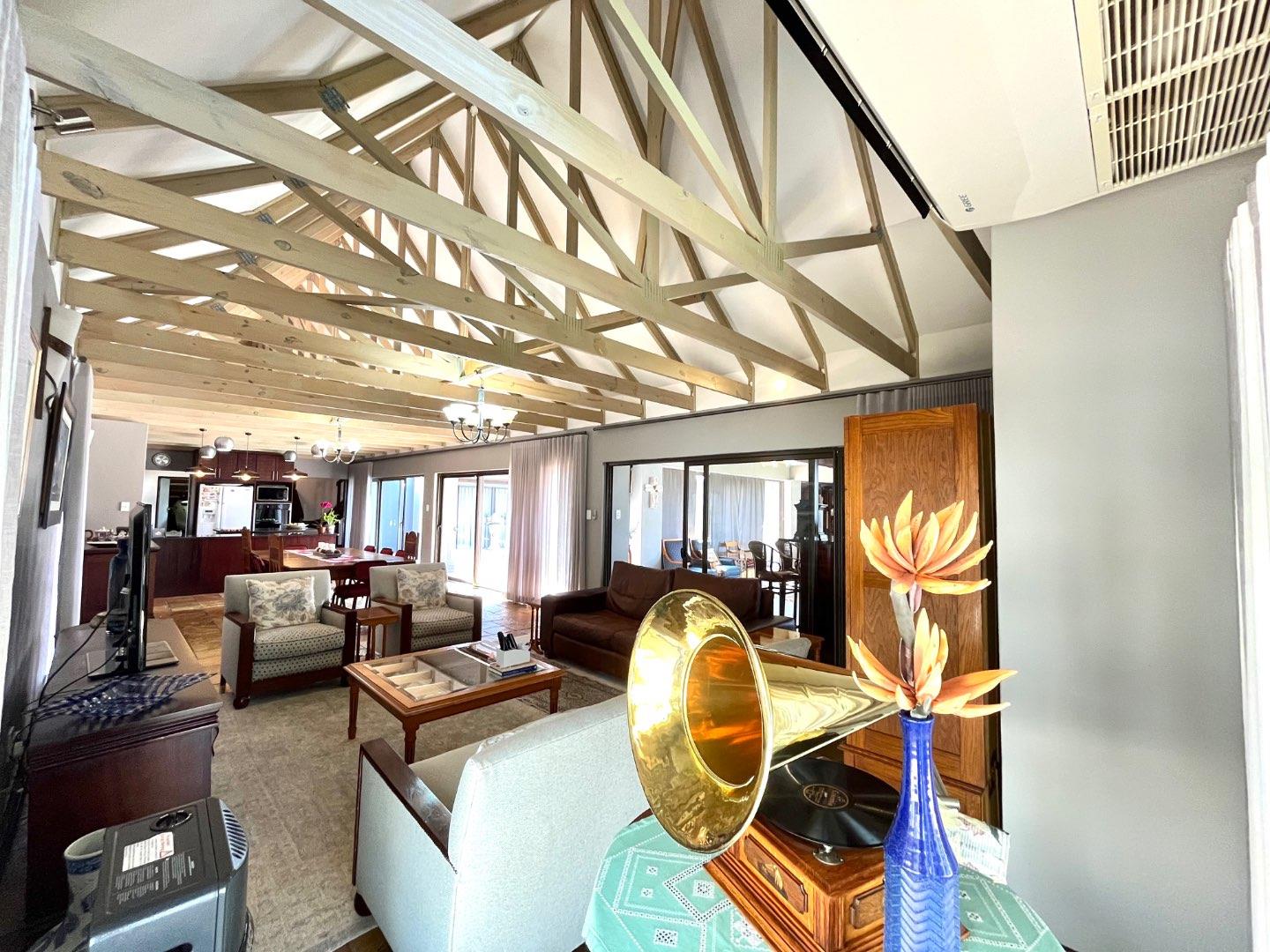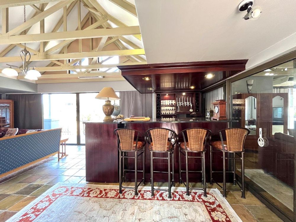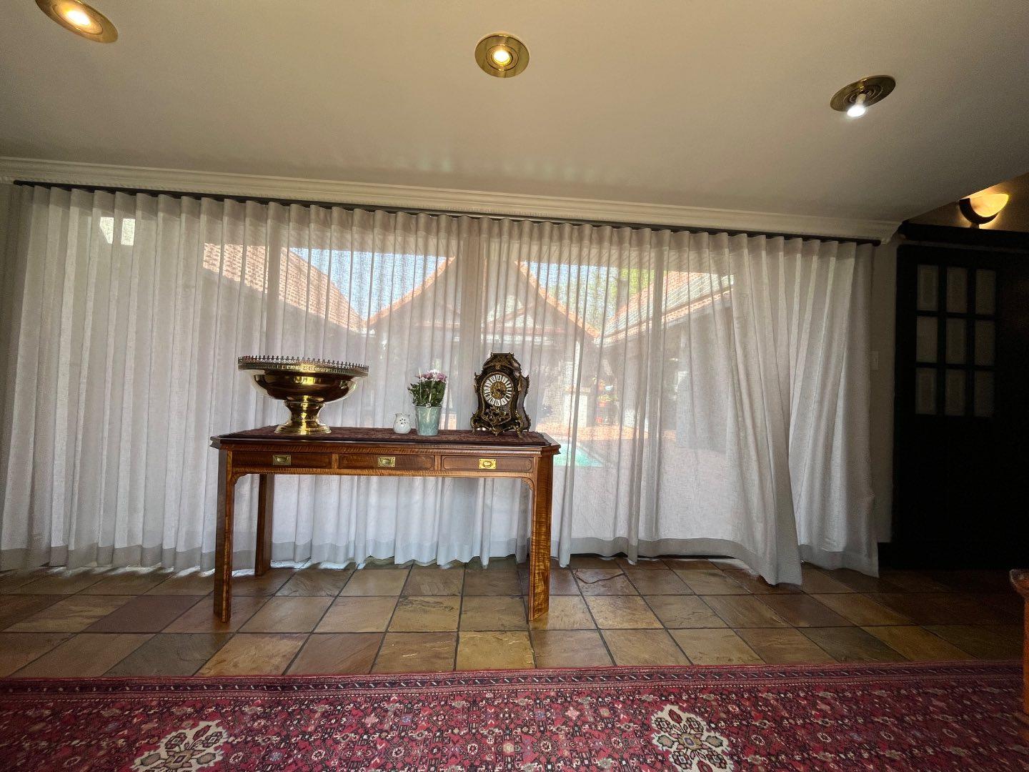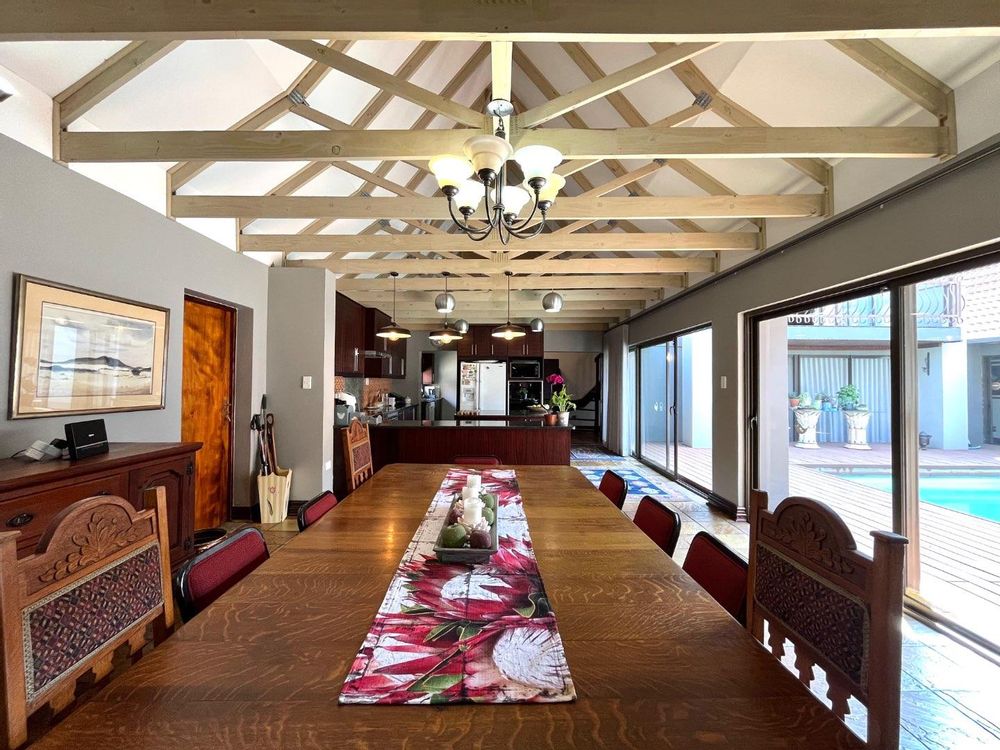 The home opens into a welcoming entrance hall that flows seamlessly into a spacious, modern open-plan kitchen, dining, and living area. The kitchen is complemented by a separate scullery and laundry, offering ample cupboard space for practical convenience. A second living area with a built-in bar creates the ideal space for entertaining, while sliding doors open onto a sparkling swimming pool, uniquely situated at the heart of the home.